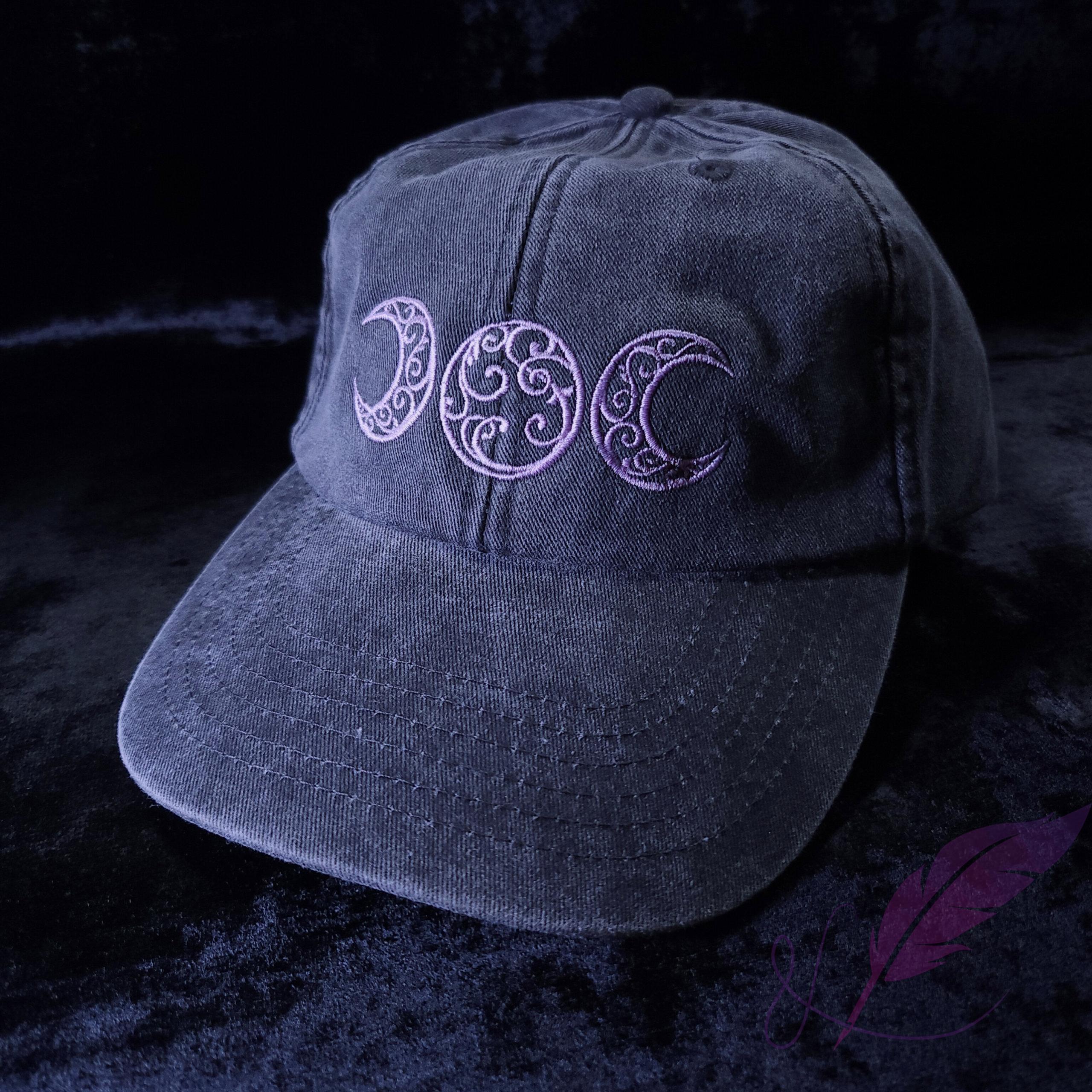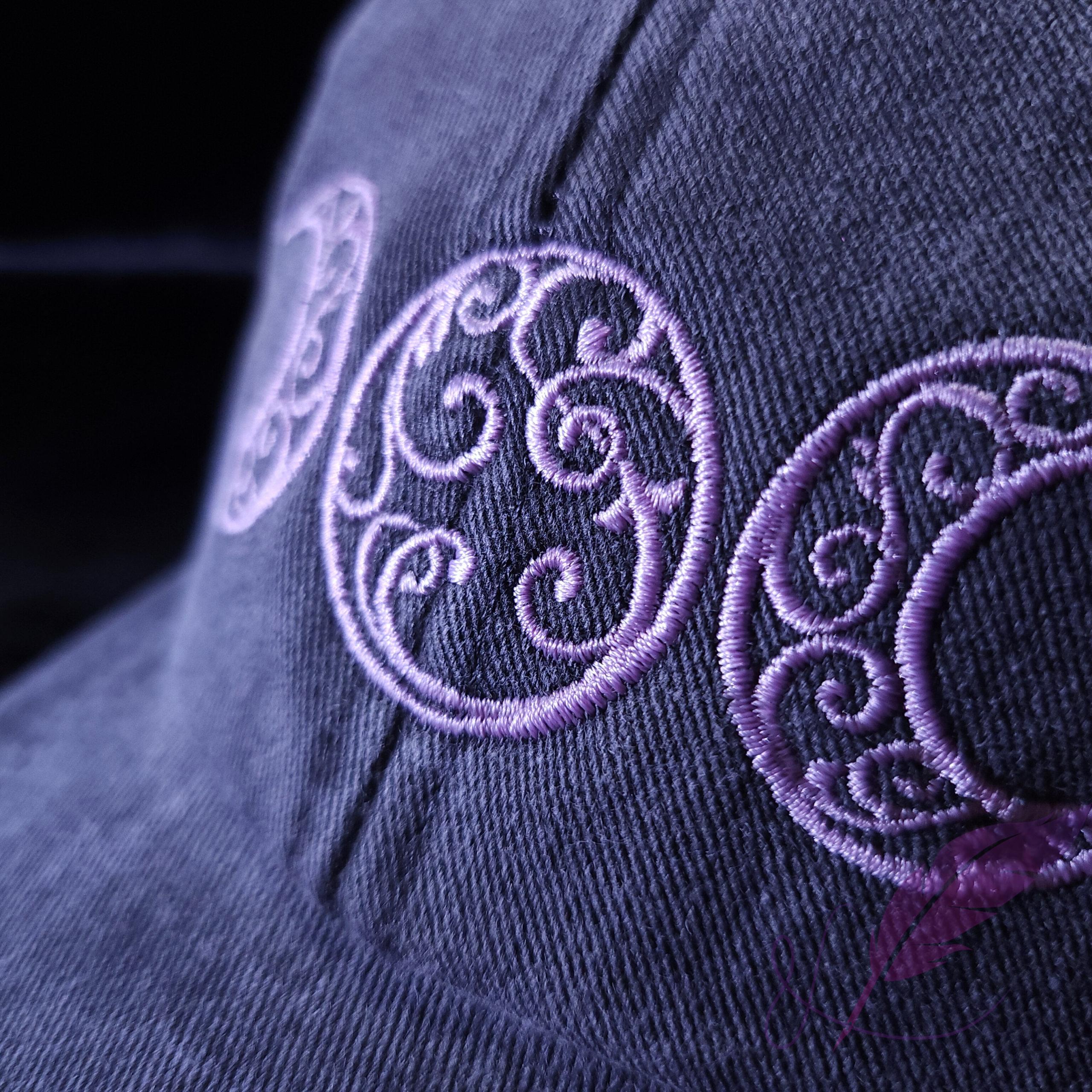Vollmond mit zwei Sichelmonden; verschnörkelt; in der Farbe Flieder gestickt